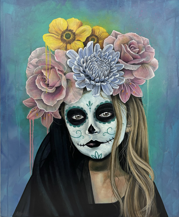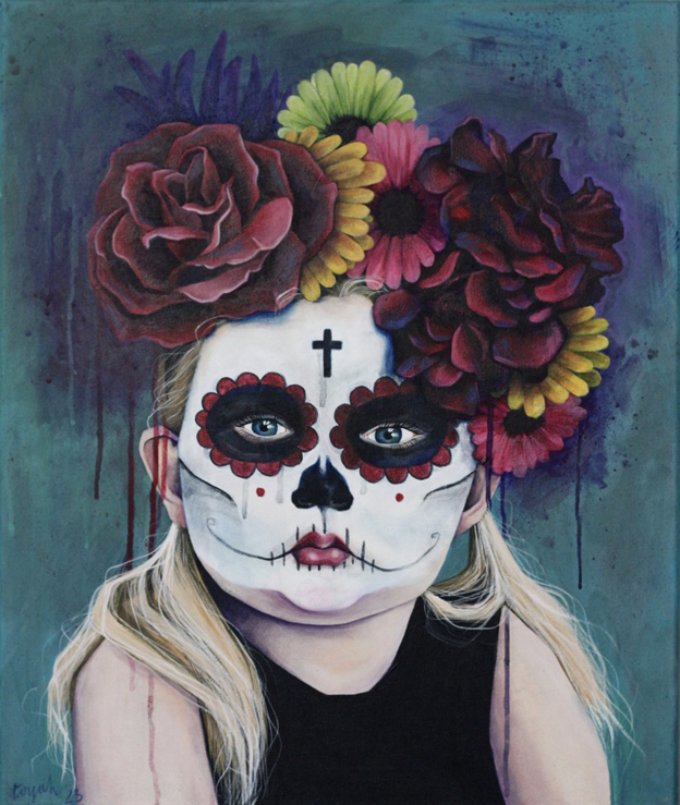 Dit schilderij is geïnspireerd op de Mexicaanse feestdag ‘dia de los muertos’ ofwel de dag der doden. Het wordt gevierd op 1 en 2 november, op 1 november eert men de overleden kinderen en op 2 november eert men de volwassenen. Men gelooft dat de zielen van de overledenen terug keren naar de aarde. Op deze dagen versiert men de graven en brengt offeren aan de overledenen. Mensen verkleden zich als de doden als een teken van respect aan de overledenen. Ik vind het een heel mooi idee dat in de Mexicaanse cultuur de dood gevierd wordt en dat de doden deel blijven uitmaken van hun familie.